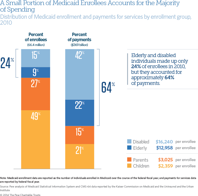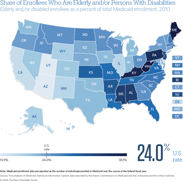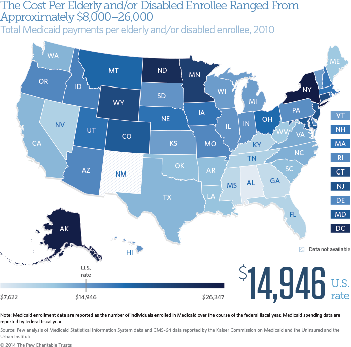 In 2010, the average Medicaid expenditure per elderly and disabled enrollee was $14,946, ranging from nearly $8,000 in Alabama to nearly $27,000 in New York. In contrast, the average Medicaid expenditure per child and parent was much lower, ranging from $1,354 in California to $5,227 in Alaska. Factors that affect this variation include program eligibility and optional benefits, provider payment rates, pharmaceutical discounts, regional differences in the cost of providing health care and the health status and poverty rate of the population.32 Many of these factors influence variation across states in per-person spending for all insured individuals, regardless of the source of their health insurance coverage.33