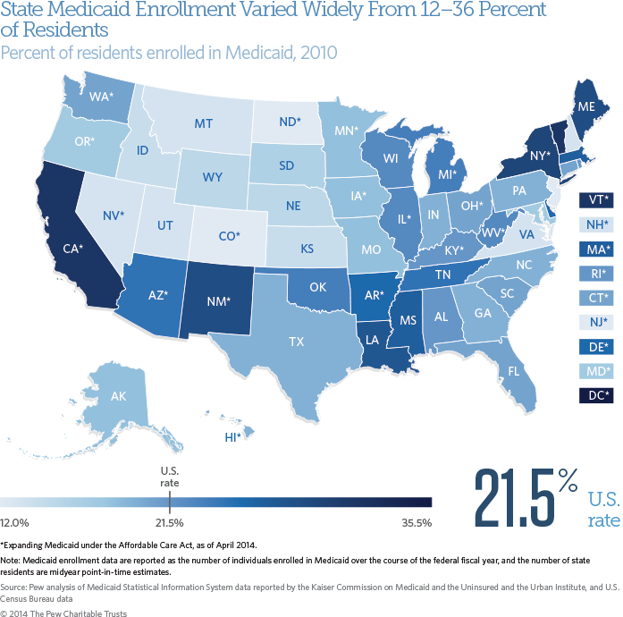 Medicaid covers more than 20 percent of Americans over the course of the year. Enrollment varies across states because of factors such as poverty rates, state decisions to expand coverage above federal minimums, and the reach of employer-sponsored health insurance.17