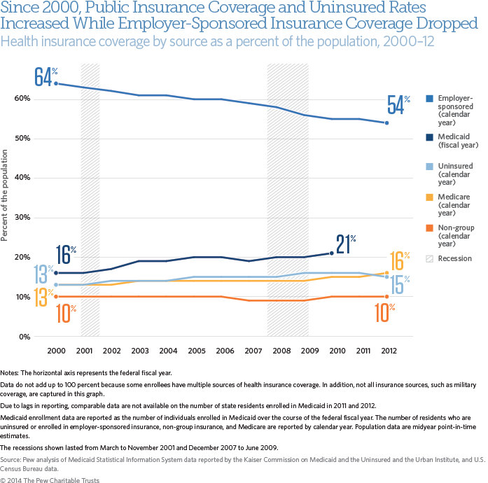 The proportion of Americans covered by employer-sponsored health insurance decreased between 2000 and 2012, with declines particularly pronounced during economic downturns. In contrast, enrollment in Medicaid and Medicare increased during those times, as did the percentage of uninsured Americans. Although actual Medicaid enrollment data are available only through 2010, U.S. Census Bureau survey estimates show that Medicaid enrollment continued to rise in 2011 but leveled off in 2012.23