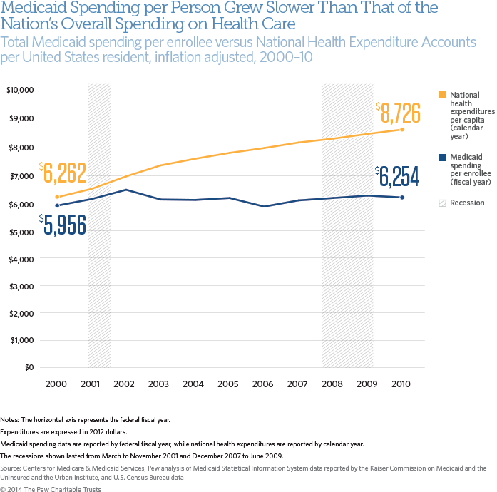 On a per-enrollee basis, Medicaid spending has remained relatively stable over the past decade, rising by only 5 percent after adjusting for inflation, from $5,956 in 2000 to $6,254 in 2010. This is substantially less than the overall health care spending per resident in the United States, which increased by 39 percent over the same period to just over $8,700 per resident.