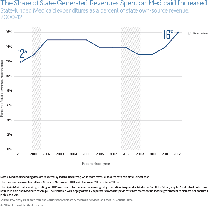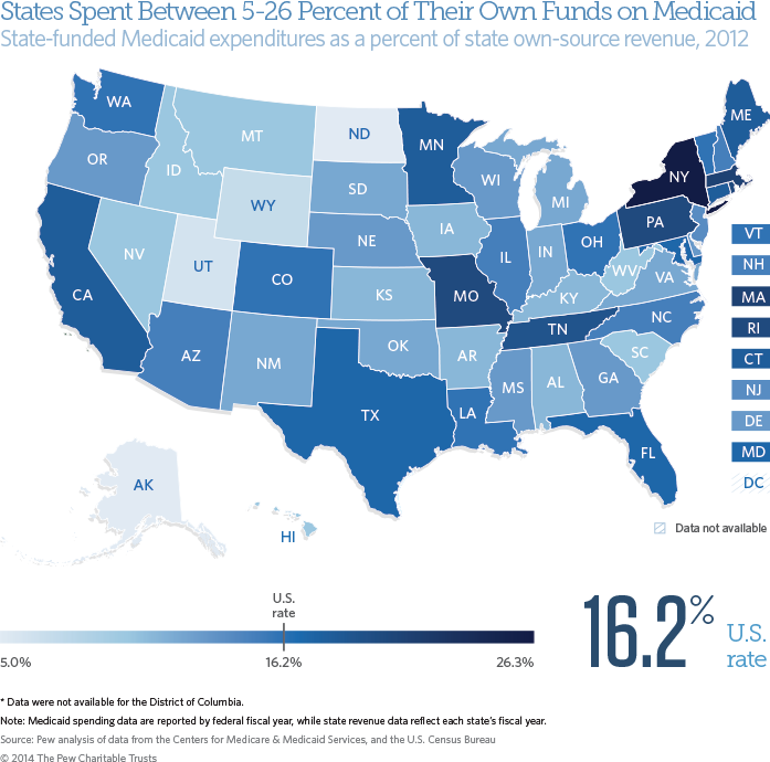 The proportion of states' own-source revenue spent on Medicaid varies greatly, from 5 percent in North Dakota to 26 percent in New York. This variation is attributable not only to state Medicaid policy decisions—the breadth of health care services covered, eligible populations, and provider payment rates—but also tax and other policy decisions that determine states' revenues.37