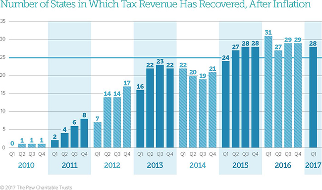 States collectively took in 5.7 percent more in the first quarter of 2017 than when total receipts peaked in the third quarter of 2008 before falling during the downturn, after accounting for inflation and averaging across four quarters to smooth seasonal fluctuations. The latest quarter was an improvement after a rare decline in mid-2016 and two quarters of stalled growth. But it still was short of a year earlier, when tax revenue hit a post-recession high of 6.6 percent above its peak during the recession.