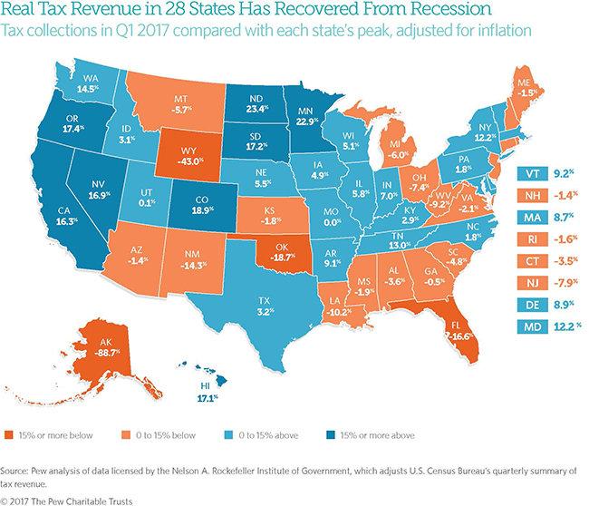 A comparison of each state’s tax receipts in the first quarter of 2017 with its peak quarter of revenue before the end of the recession, averaged across four quarters and adjusted for inflation, shows: