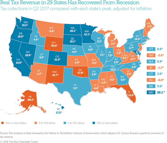A comparison of each state’s tax receipts in the second quarter of 2017 with its peak quarter of revenue before the end of the recession, averaged across four quarters and adjusted for inflation, shows: