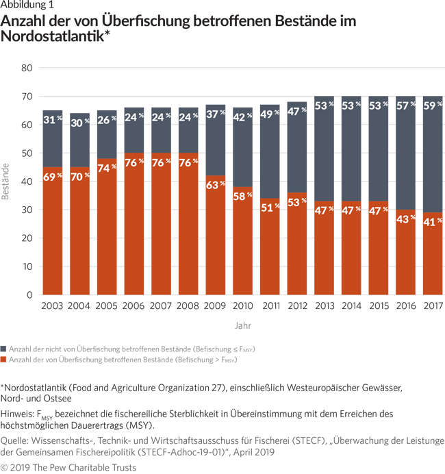 - Nur von sehr wenigen Beständen weiß man, dass sie das vom EU-Recht geforderte Erholungsniveau erreicht haben (PDF) Ein 2017 von The Pew Charitable Trusts beauftragter Bericht – „Taking Stock – Bestandsaufnahme“ (PDF) – kam zu dem Schluss, dass 24 bis 56 Prozent der Bestände weiterhin unterhalb der von der GFP geforderten Werte lagen.