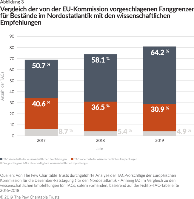 Seit Inkrafttreten der reformierten GFP im Jahr 2014 vergleicht The Pew Charitable Trusts alljährlich die Entscheidungen der Fischereiminister über die Fanggrenzen im Nordostatlantik mit den verfügbaren wissenschaftlichen Empfehlungen. Obwohl der Anteil der die Empfehlungen überschreitenden Fanggrenzen rückläufig ist, sind die Fortschritte zu langsam, um die von der GFP gesetzte Frist zur Beendigung der Überfischung einzuhalten.