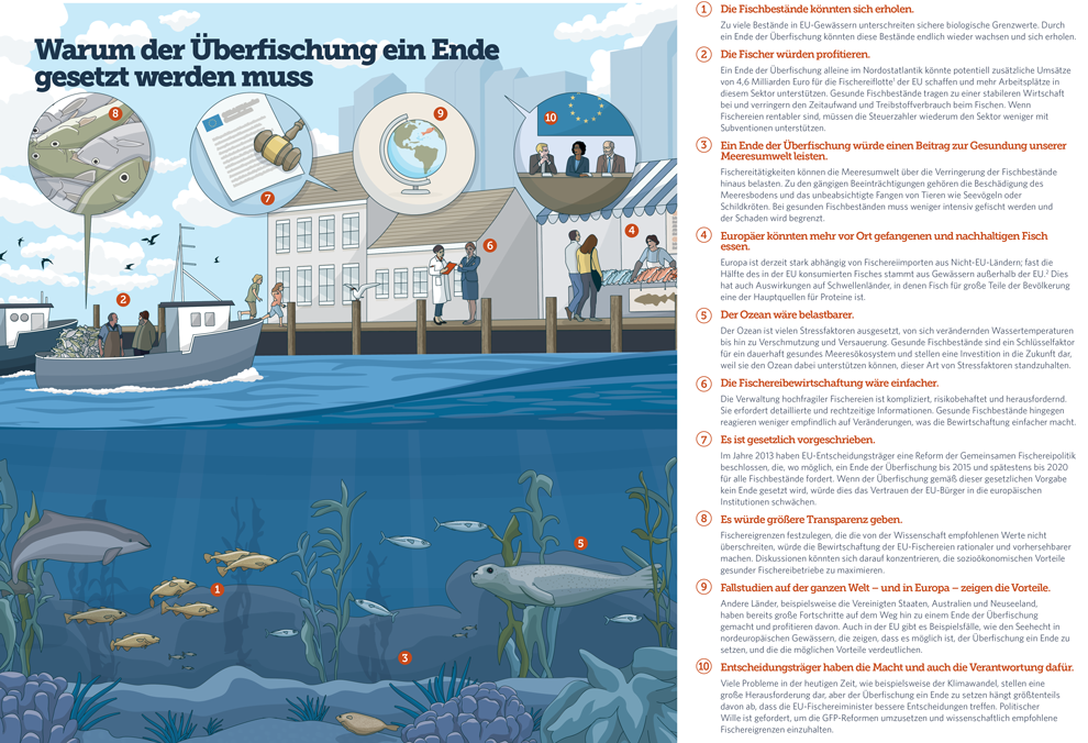 Die reformierte Gemeinsame Fischereipolitik (GFP) der EU, die Anfang 2014 in Kraft getreten ist, fordert wo möglich ein Ende der Überfischung bis 2015, spätestens jedoch bis 2020. Es ist von entscheidender Bedeutung, die Fischbestände durch wissenschaftlich begründete Bewirtschaftung wiederaufzufüllen – nicht nur, weil das Gesetz dies verlangt, sondern auch, weil so dazu beigetragen werden kann, eine gesunde Meeresumwelt für zukünftige Generationen zu garantieren.