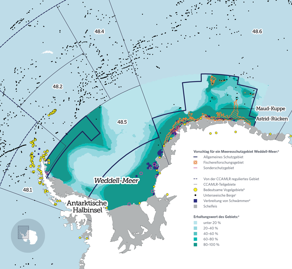 Die Kommission zur Erhaltung der lebenden Meeresschätze der Antarktis (CCAMLR) erwägt einen Vorschlag zur Schaffung eines Meeresschutzgebiets im Weddell-Meer, das sich über 1,8 Mio. km² erstrecken würde. Das Weddell- Meer ist eine abgelegene, eisbedeckte Bucht östlich der Antarktischen Halbinsel und eines der ursprünglichsten Meeresökosysteme der Welt. Dieses Gebiet ist ein einzigartiger Lebensraum, der für seine außergewöhnliche Artenvielfalt bekannt ist. Dazu gehören unter anderem der antarktische Sturmvogel, der Kaiser‑ und der Adéliepinguin sowie viele Robben‑ und Walarten. Weit unter dem Meereseis bilden nährstoffreiche, benthische Ökosysteme den Hauptlebensraum für eine Reihe von Lebewesen, die nirgendwo sonst auf der Erde zu finden sind, wie z. B. Glasschwämme und Kaltwasserkorallen.