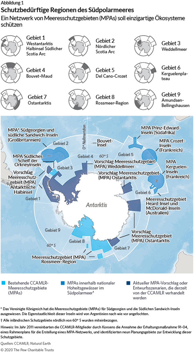 Zum Erhalt dieser spektakulären Region arbeiten The Pew Charitable Trusts und seine Partner gemeinsam mit der Kommission zur Erhaltung der lebenden Meeresschätze der Antarktis (Commission for the Conservation of Antarctic Marine Living Resources – CCAMLR) sowie deren Mitgliedsregierungen daran, , diejnigen Praktiken zur Fischereibewirtschaftung zu fördern, die ökosystemorientiert ausgerichtet sind. Darüberhinaus ist das Ziel, ein Netzwerk aus großflächigen Meeresschutzgebieten (MPAs, Marine Protected Areas) rund um die Antarktis aufzubauen.