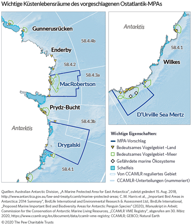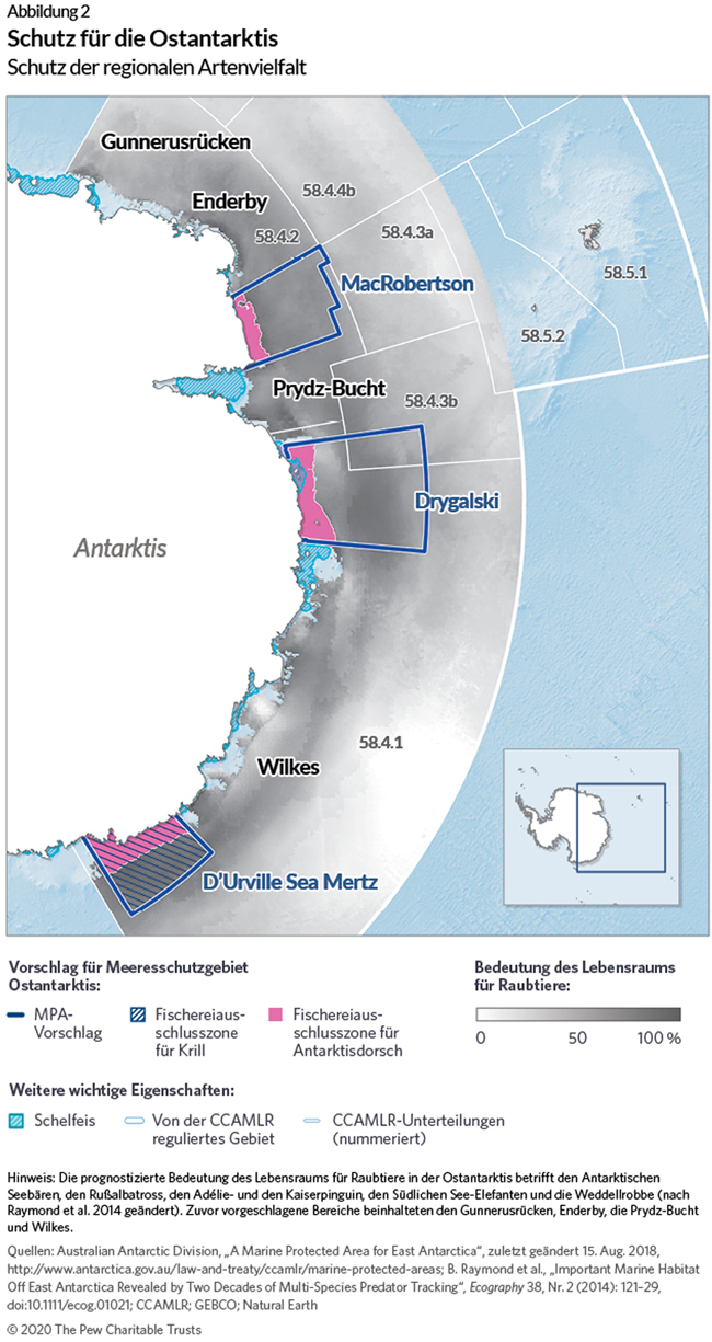 - Australian Antarctic Division, „A Marine Protected Area for East Antarctica“, zuletzt geändert 15. Aug. 2018, http://www.antarctica.gov.au/law-and-treaty/ccamlr/marine-protected-areas; B. Raymond et al., „Important Marine Habitat Off East Antarctica Revealed by Two Decades of Multi-Species Predator Tracking“, Ecography 38, Nr. 2 (2014): 121–29, doi:10.1111/ecog.01021.