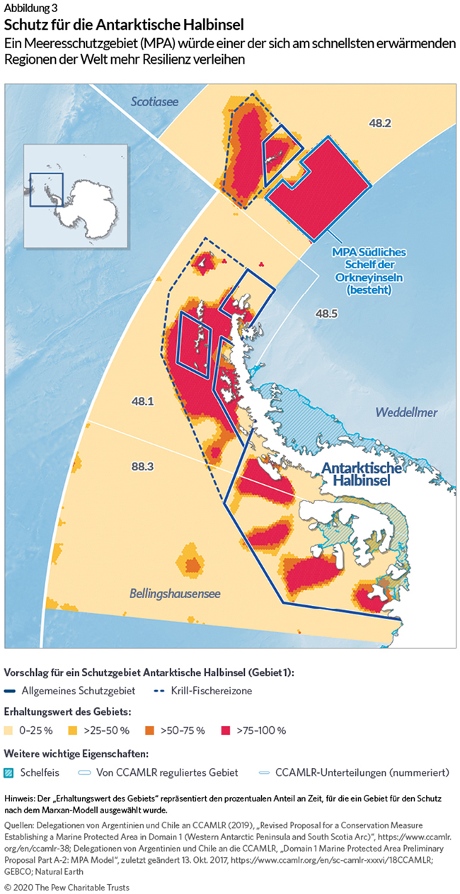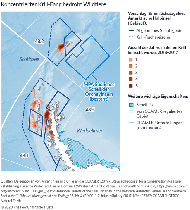 Der Vorschlag für das Meeresschutzgebiet Antarktische Halbinsel (Gebiet 1) umfasst eine Allgemeine Schutzzone,27 die zwei artenreiche Abschnitte abdeckt – die Bransfield- und Gerlache-Straße – und würde den Krillfang in den Futtergebieten der antarktischen Raubtiere an der Küste verbieten. Es schützt auch einen Teil der Bellingshausensee, das ein wichtiger Brut- und Aufzuchtbereich für Krill ist, sowie andere ökologisch wichtige Gebiete für kommerziell wertvolle Fischarten. In der Krillfang-Zone wäre der kommerzielle Fischfang für Mitgliedstaaten unter Beachtung der Schutzmaßnahmen der CCAMLR gestattet. CCAMLR arbeitet daran, eine ökosystembasierte Fischereibewirtschaftung voranzutreiben, um das langfristige Überleben der Fischerei zu gewährleisten und die zahlreichen Spezies zu schützen, die auf den Antarktischen Krill angewiesen sind.