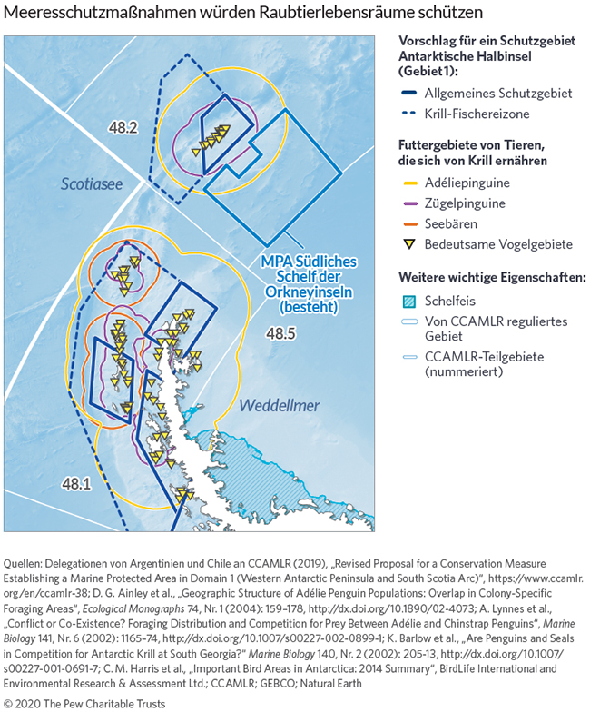 - D. G. Ainley et al., „Geographic Structure of Adélie Penguin Populations: Overlap in Colony-Specific Foraging Areas“, Ecological Monographs 74, Nr. 1 (2004): 159–178, http://dx.doi.org/10.1890/02-4073; A. Lynnes et al., „Conflict or Co-Existence? Foraging Distribution and Competition for Prey Between Adélie and Chinstrap Penguins“, Marine Biology 141, Nr. 6 (2002): 1165–74, http://dx.doi.org/10.1007/s00227002-0899-1; K. Barlow et al., „Are Penguins and Seals in Competition for Antarctic Krill at South Georgia?“ Marine Biology 140, Nr. 2 (2002): 205–13, http://dx.doi.org/10.1007/s00227-001-0691-7; C. M. Harris et al., „Important Bird Areas in Antarctica: 2014 Summary“, BirdLife International and Environmental Research & Assessment Ltd.; L. Krüger, „Spatio-Temporal Trends of the Krill Fisheries in the Western Antarctic Peninsula and Southern Scotia Arc“, Fisheries Management and Ecology 26, Nr. 4 (2019): 1–7, https://doi.org/10.1111/fme.12363.