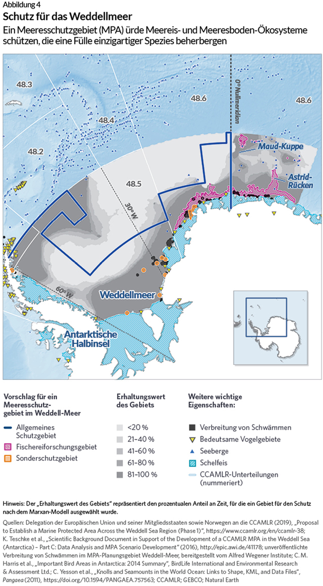 - Delegation der Europäischen Union und seiner Mitgliedstaaten sowie Norwegen an die CCAMLR (2019), „Proposal to Establish a Marine Protected Area Across the Weddell Sea Region (Phase 1)“, https://www.ccamlr.org/en/ccamlr-38; K. Teschke et al., „Scientific Background Document in Support of the Development of a CCAMLR MPA in the Weddell Sea (Antarctica) – Part C: Data Analysis and MPA Scenario Development“ (2016), http://epic.awi.de/41178; unveröffentlichte Verbreitung von Schwämmen im MPA-Planungsgebiet Weddellmeer, bereitgestellt vom Alfred Wegener Institute; C. M. Harris et al., „Important Bird Areas in Antarctica: 2014 Summary“, BirdLife International and Environmental Research & Assessment Ltd.; C. Yesson et al., „Knolls and Seamounts in the World Ocean: Links to Shape, KML and Data Files“, Pangaea (2011), https://doi.org/10.1594/PANGAEA.757563