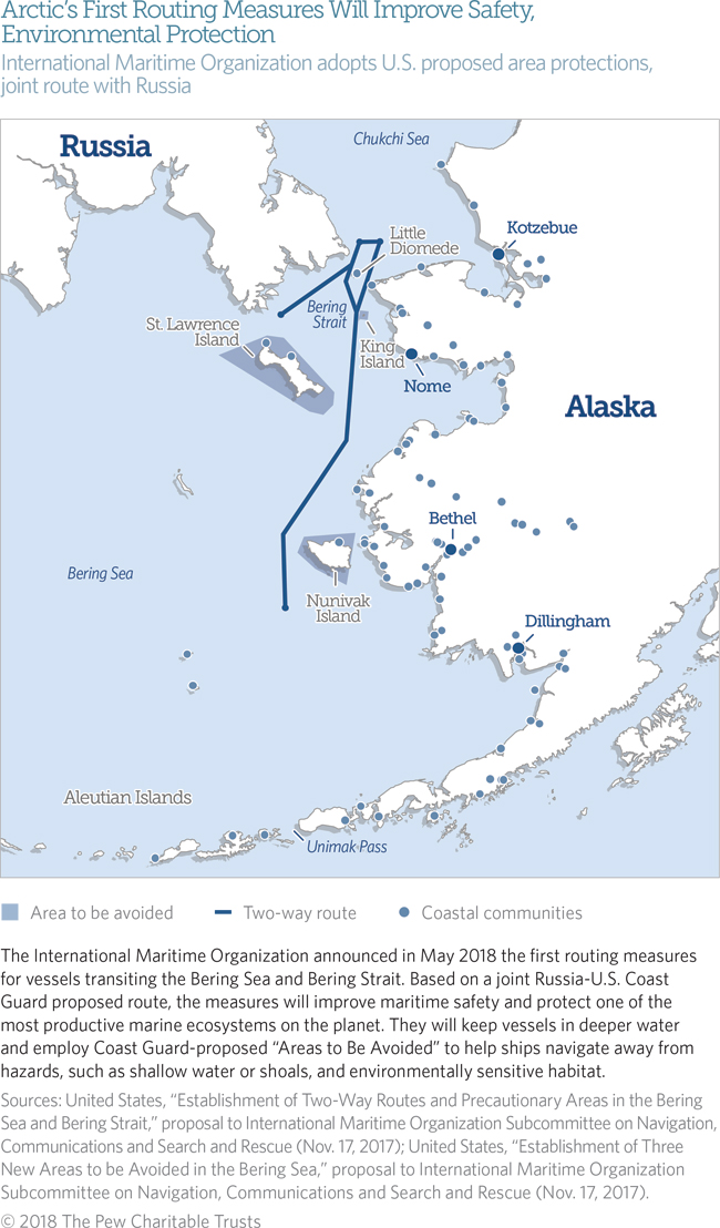 WASHINGTON—The Pew Charitable Trusts today applauded the International Maritime Organization (IMO), a U.N. agency, for adopting the first two-way route for ships transiting the Arctic. The IMO accepted a joint Russia-U.S. proposed route through the Bering Strait and the Bering Sea, as well as three Areas to Be Avoided that were submitted by the U.S. Coast Guard based on a study of the region’s vessel traffic trends as well as its ecological and cultural values.