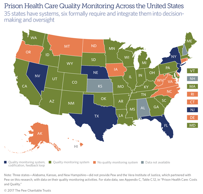 Thirty-five states reported that they operated a prison health care quality monitoring system in fiscal year 2016. Of these, however, only six—Florida, Nebraska, Nevada, New Jersey, New York, and Texas—indicated that they required quality monitoring and built in regular opportunities to incorporate the findings into decision-making and legislative oversight. Such practices can help define priorities, bolster consistency amid personnel changes, and ensure that objectives are met.