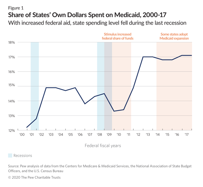 In response to the two previous recessions, the federal government sent extra Medicaid dollars to states: $10 billion in the wake of the 2001 downturn and $99 billion during the Great Recession, which ran from December 2007 through June 2009.