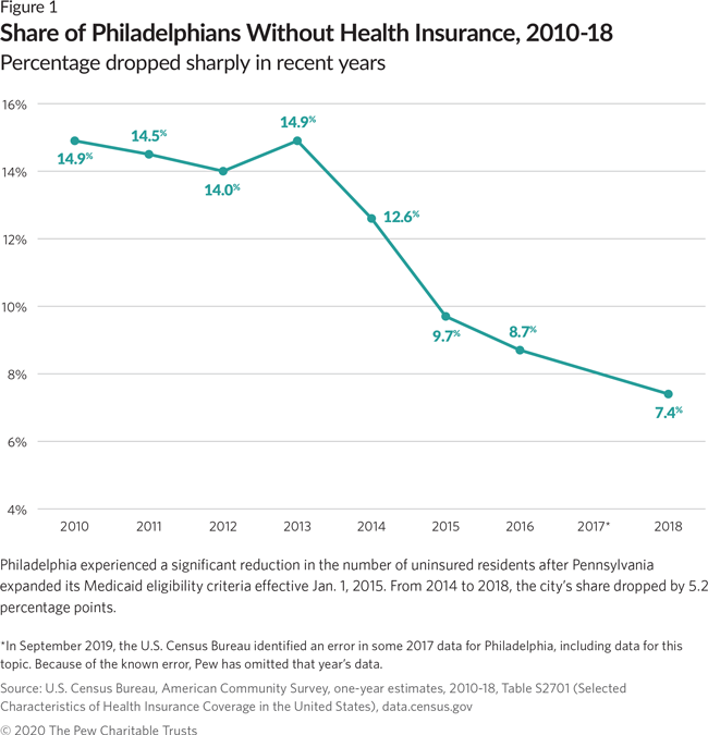 In 2018, the most recent year for which data is available, just over 7% of Philadelphia residents—approximately 116,000 people—lacked health insurance. That’s half as high as in 2010, when the U.S. census first began tracking these numbers. At that point, about 225,000 people were uninsured. The share of individuals without health insurance had declined by 5.2 percentage points since 2014, primarily as a result of the state’s decision to expand Medicaid eligibility under the Affordable Care Act. Effective in January 2015, Pennsylvania households with incomes up to 138% of the federal poverty line became eligible for medical assistance, not just those living below the poverty line.