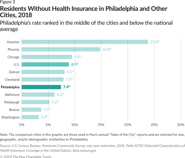 Pew’s annual “State of the City” reports compare Philadelphia with nine other cities selected for their similarities to Philadelphia in location, size, and demographic makeup. Philadelphia’s share of uninsured residents in 2018 was the fifth lowest among the cities and was below the U.S. average of 8.9%. Houston—located in Texas, which did not expand Medicaid under the Affordable Care Act—had the highest rate of residents without health insurance on the list at 23.8%.