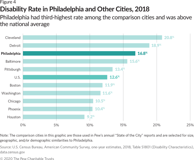 In 2018, the most recent year for which data was available, Philadelphia still had a high share of residents with disabilities compared with other large cities. At 16.8%, Philadelphia’s rate trailed only Cleveland and Detroit. The rate had increased slightly since Pew’s 2016 analysis on the topic. That report found that people with a physical, emotional, or cognitive disability were more likely to have frequent interactions with the health care system—and explained how age and poverty factor in. Data from Pew’s 2019 “State of the City” report shows that only Philadelphia and two other cities on this list—Cleveland and Baltimore—had increases in their disability rates since 2017.