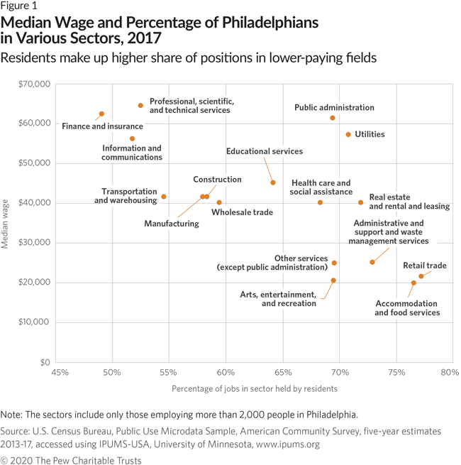 Data from the U.S. Census Bureau’s American Community Survey indicates that Philadelphians make up more than three-quarters of the city’s workforce in the retail trade and accommodations/food services sectors. And these are two of the three lowest-paying industries in the city, with median earnings of less than $22,000 per year. (See Figure 1.) These sectors account for approximately 47,000 Philadelphians working in retail and another 40,000 employed in accommodations and food services.