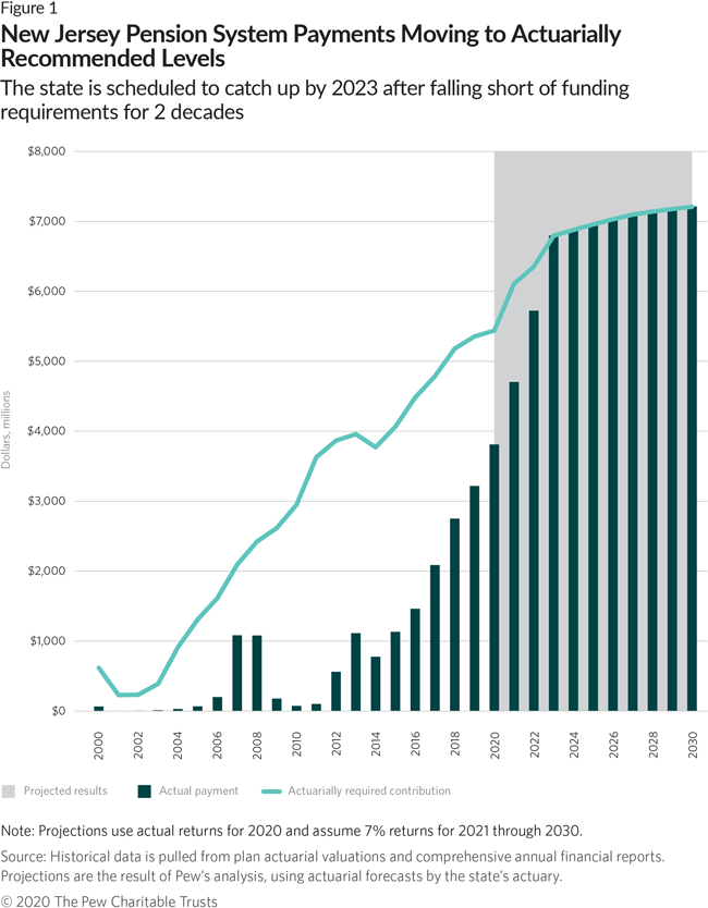 This year, the state actuary produced timely projections that assessed the impact of COVID-19 on pension plan balance sheets. In addition, Pew provided an independent stress test analysis to Senate President Stephen Sweeney (D) and then to state policymakers. The results of that analysis, which included a new framework to account for the economic impact of the pandemic on state finances and pension investments, indicated the $4.7 billion payment was only slightly over the minimum contribution required to protect against fiscal distress. The full payment illustrates New Jersey’s fiscal discipline as well as leaders’ commitment to pensioners and stabilizing the state pension systems.