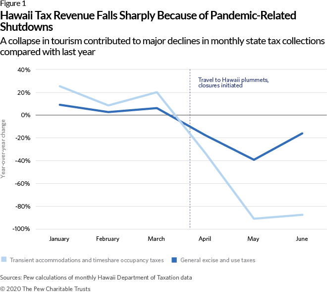 The hit to Hawaii’s budget has been severe: The state’s latest revenue forecast shows an estimated 19.6% general fund tax revenue loss this year on top of a 9.7% decline in fiscal year 2020 from pre-pandemic projections. In fact, when estimated revenues for both years are compared to fiscal 2019, the cumulative decline in percentage terms is greater than any other nonenergy state, according to a Pew analysis of revenue forecasts.