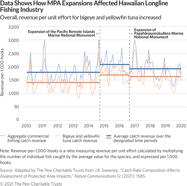 The data shows that revenue per unit effort generally increased since the expansions began in 2014 and further increased for the 16 months following the Papahānaumokuākea monument expansion. “It now appears that the Papahānaumokuākea expansion actually benefited” Hawaii’s tuna fishery, the researchers explained.