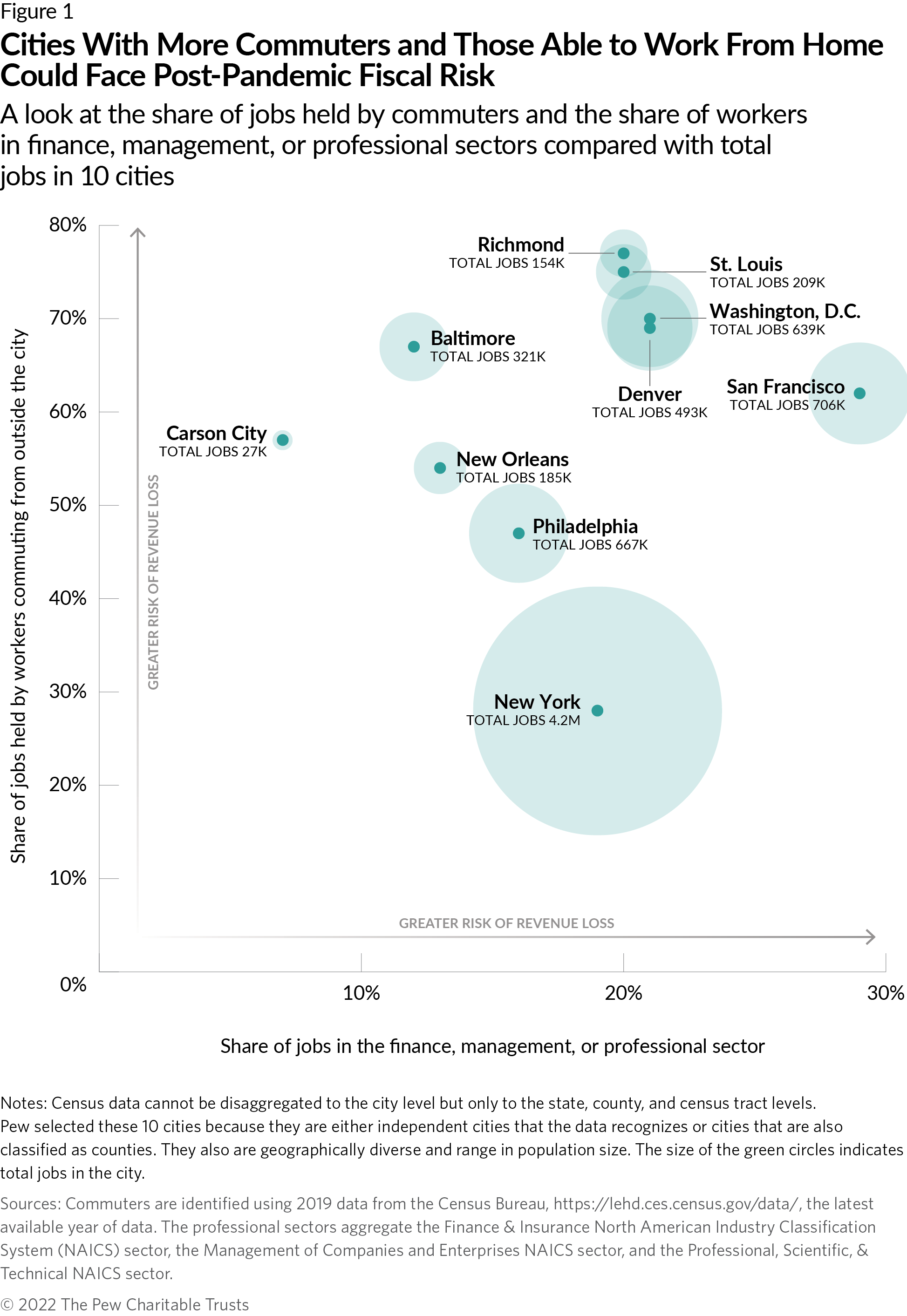 This data visualization using 2019 Census Bureau data shows the share of commuters among the workforces of 10 cities—Baltimore; Carson City, Nevada; Washington, D.C.; Denver; New Orleans; New York; Philadelphia; Richmond, Virginia; San Francisco; and St. Louis. The proportion of commuters can provide insight into the relative risk to each city’s revenue base. The commuter share is defined as the proportion of jobs in a city with employees who live outside the city. The data visualization also depicts the share of total jobs in the city that are in the finance, management, or professional sector. (See notes below.)