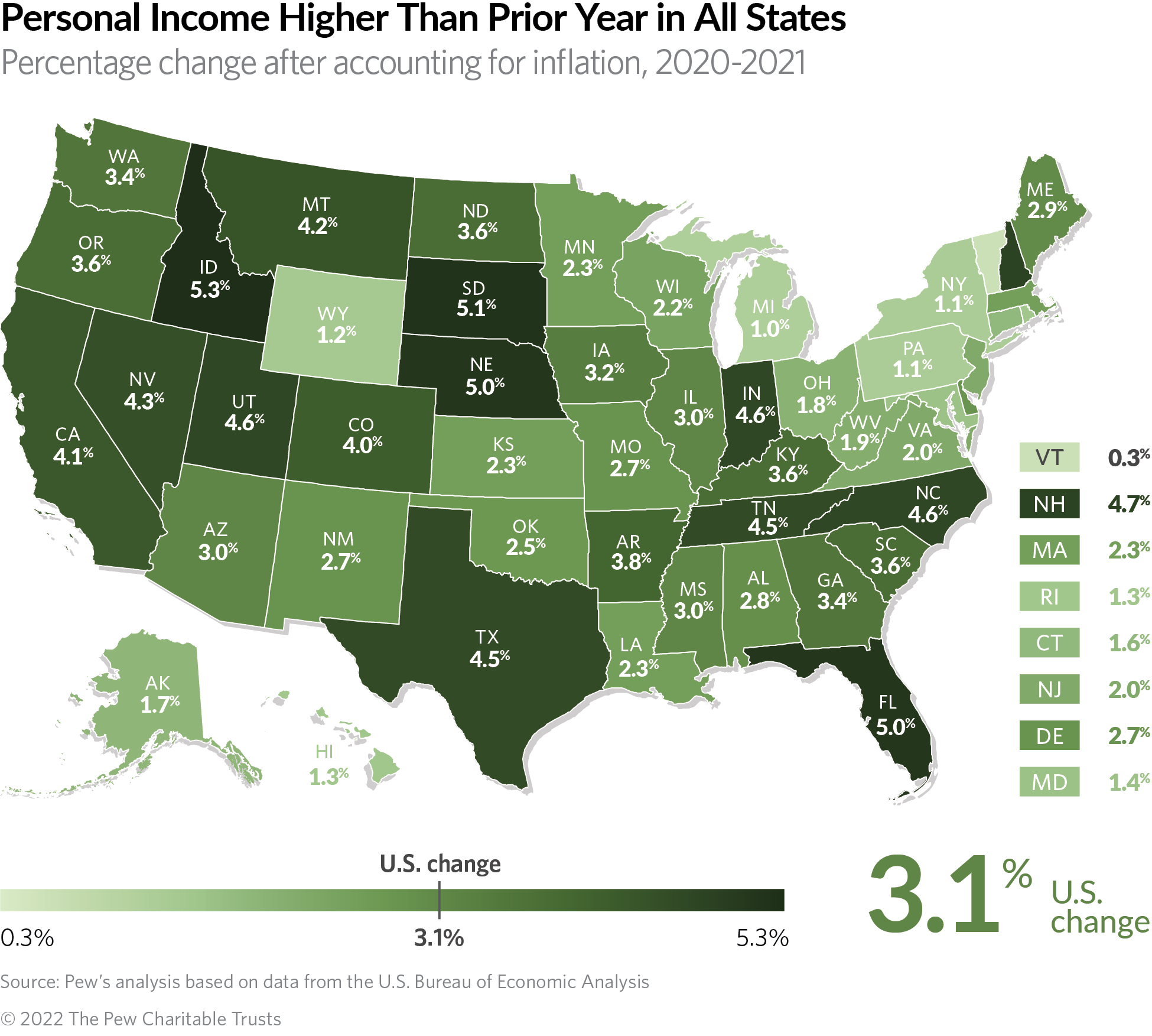 Year-over-year results for the fourth quarter of 2021 are based on estimates and are subject to revision, as is Pew’s ranking of growth rates for state personal income.