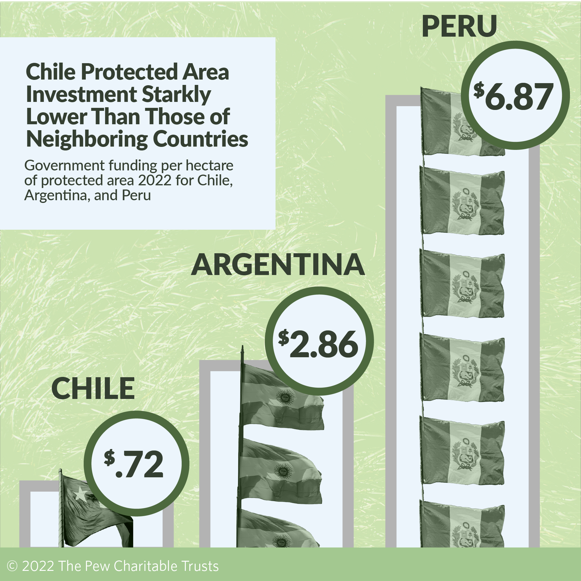 In 2022, Chile budgeted just $25.8 million ($0.64 per hectare) for protected areas. This stands in stark contrast to the sums that neighboring countries have dedicated to this purpose this year. Argentina, for example, allocated nearly four times as much ($2.55 per hectare), while Peru budgeted nearly 10 times as much ($6.11 per hectare).