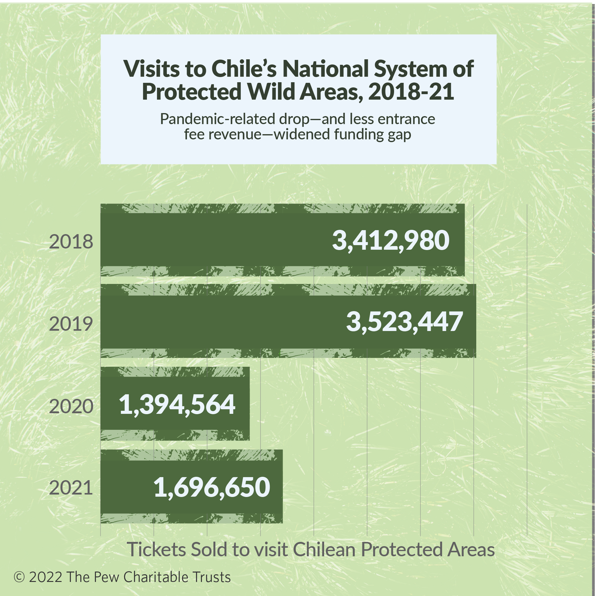 Compounding the issue, many of Chile’s national parks and reserves were forced to close to the public in 2020 and 2021 because of the COVID-19 pandemic, and those that remained open saw a precipitous drop in the number of visitors. Both factors had a significant impact on park funding, with visits to national parks and reserves down more than 50% in 2020 and 2021 from the two previous years.