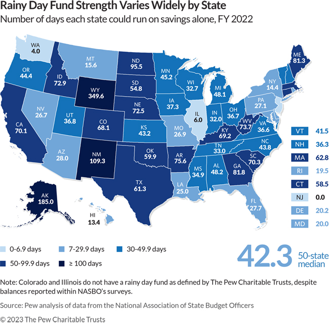 - Thirty-two states had increases in the length of time they could run government operations on rainy day funds alone compared with a year earlier. The largest gains were in Alaska (+101.6 days), Arkansas (+62.6), Kansas (+39), Nebraska (+34.8), and Maine (+34.7). The largest declines were in California (-47.9 days), New Hampshire (-22.3), North Dakota (-20.2), New Jersey (-19.9), and Colorado (-19). (Colorado does not have a rainy day fund as defined by The Pew Charitable Trusts.)