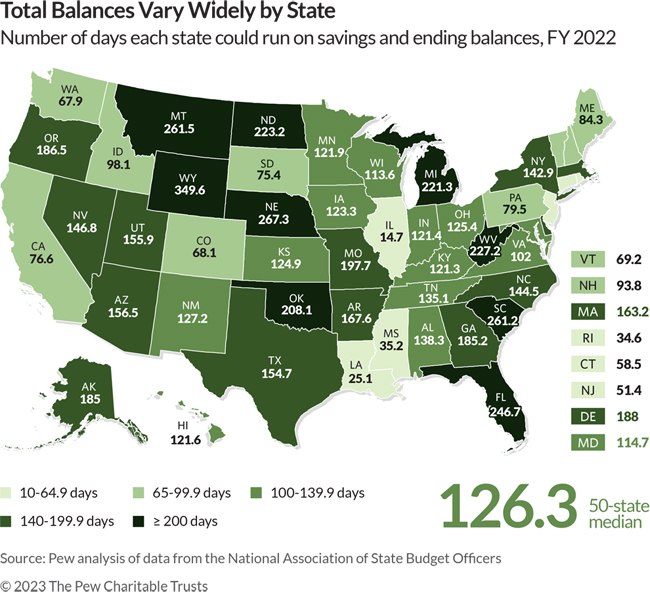 - The highest-ranked state for total balances was the same as for rainy day funds: Wyoming (349.6 days). Thirty-four other states—the largest count on record—had total balances that could cover more than 100 days’ worth of operating costs.