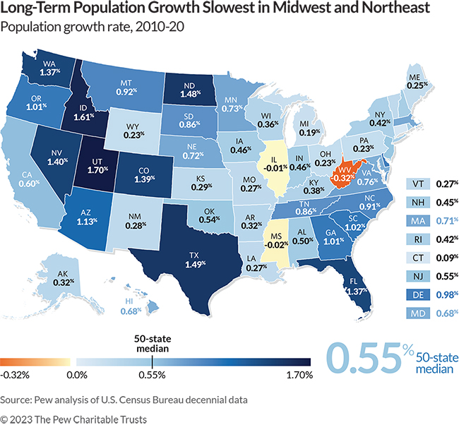 Population trends are tied to states’ economic fortunes and government finances. More people usually means more workers and consumers adding to economic activity as they take jobs and buy goods and services, which generates more tax revenue. A growing economy, in turn, can attract even more workers and their families. The reverse is usually true for states with shrinking or slow-growing populations. For that reason, some states have started to experiment with policy options to combat sluggish population growth. Maine, for example, is offering a tax incentive for college graduates to relocate there, while West Virginia and Vermont are offering financial incentives to attract new workers.