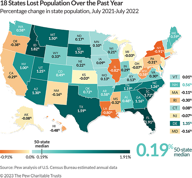 Editor’s note: This article is an annual update to the population change indicator for Pew's Fiscal 50 project. It was further updated on June 12, 2023, to correct the ratio of states with population loss in 2022.