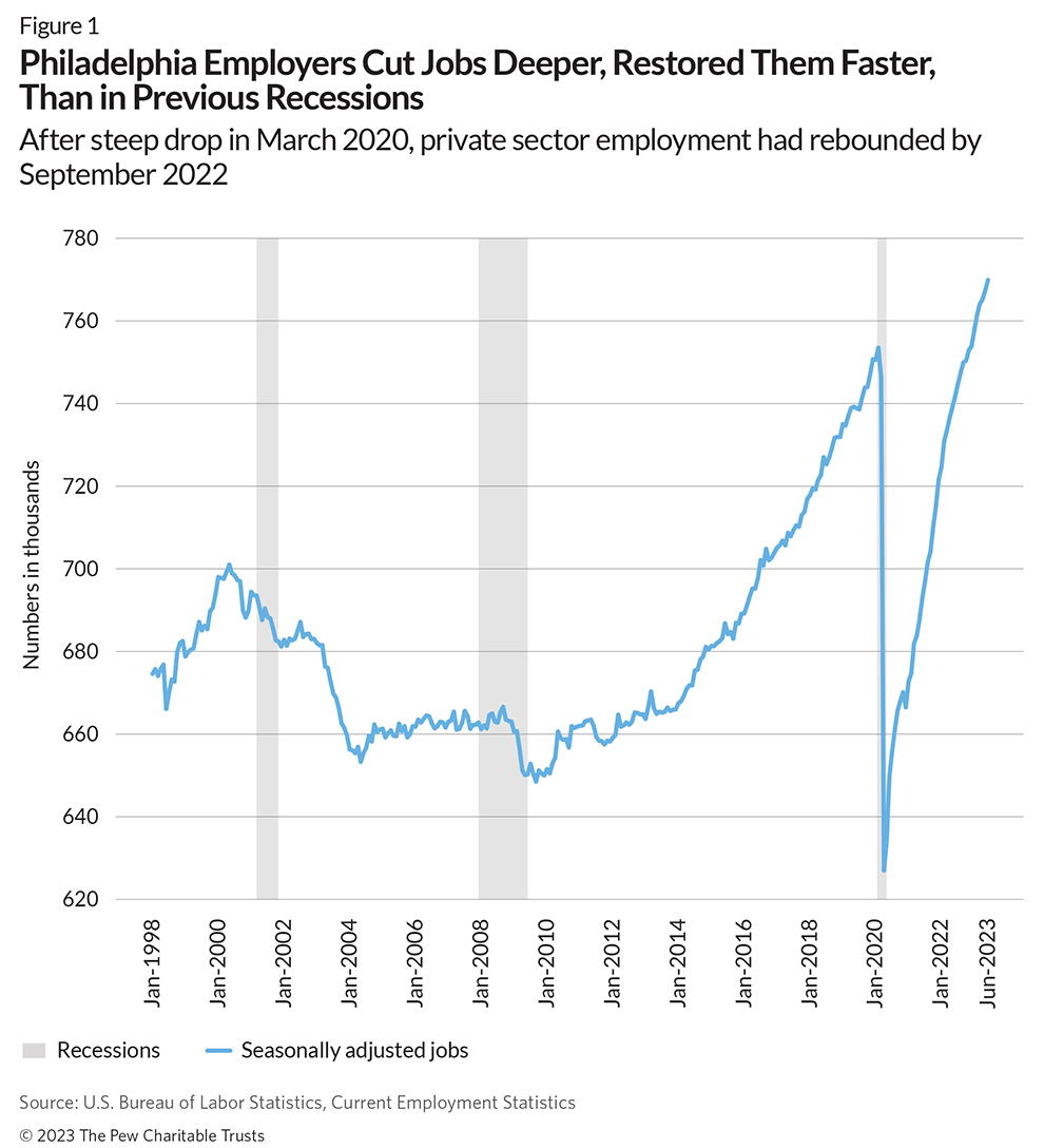The interactive dashboard on Philadelphia businesses and jobs produced by The Pew Charitable Trusts for leaders and citizens during the COVID-19 pandemic offered a quarterly look at the city’s struggles and recovery progress. Now that the data is no longer being updated, one of the dashboard’s top takeaways was a positive one: Smaller businesses led the city’s job recovery and ultimately increased their share of total employment.