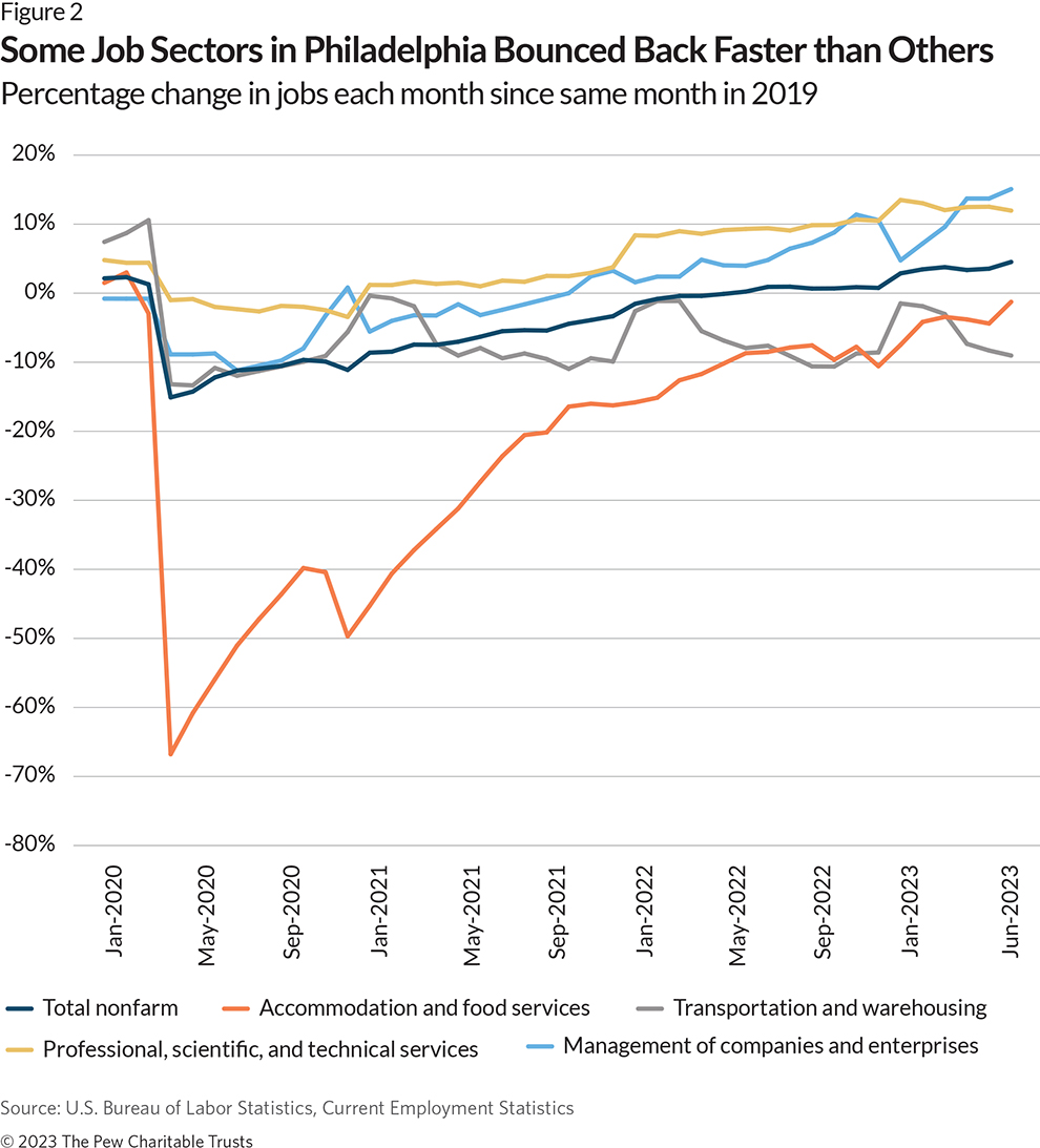 Economic shocks typically affect not just total jobs, but also the distribution of jobs across industry sectors. During the pandemic period, Philadelphia’s biggest job sector, health care and social assistance, grew slightly from annual averages of 23% of all jobs in 2019 to 24% in 2023. Government remained the second biggest. The city’s professional and technical sector added enough jobs to nearly tie educational services for third largest, each representing around 9% of all jobs. But the pandemic bumped the accommodations and food sector down to fifth from fourth, accounting for below 8% of all jobs as of mid-2023. That sector is still recovering.