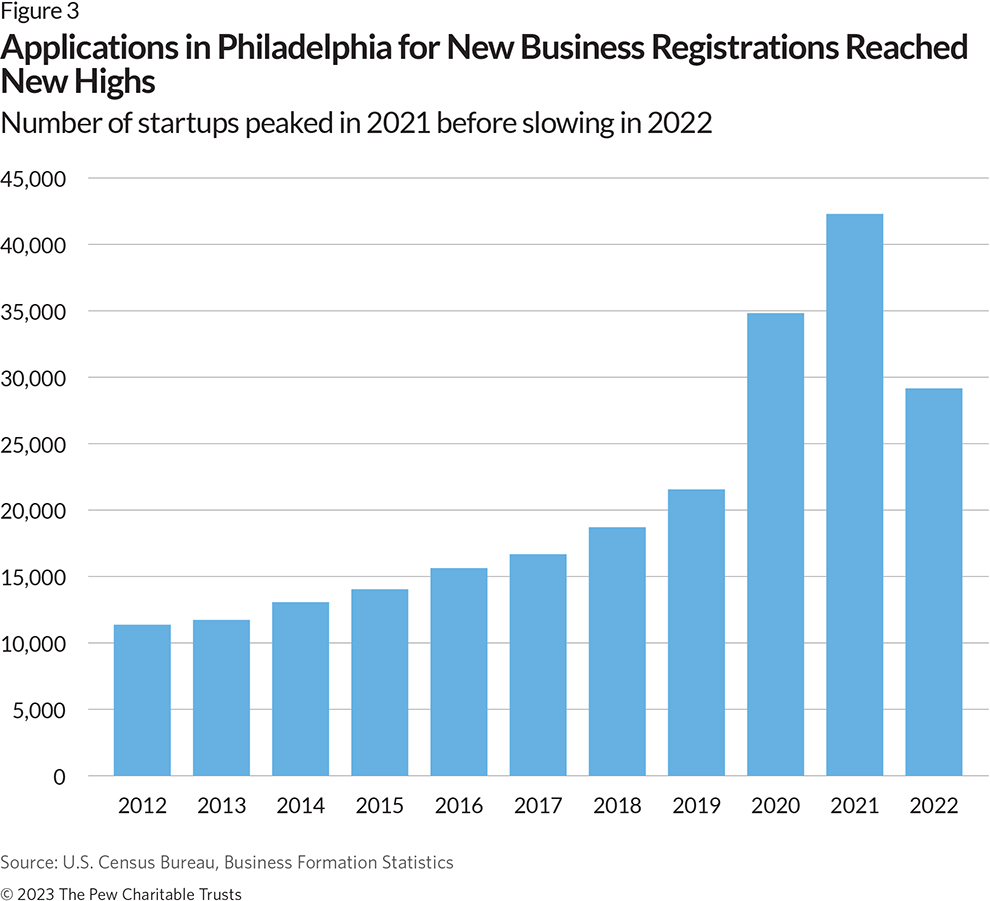 By December 2022, Philadelphia firms were operating 35,336 worksites with employees, 1.4% more than in March 2020. The data does not make clear how many were wholly new companies, or just new offices or divisions. At least some were startups: The number of applications for employer identification numbers in Philadelphia rose 35% from 2019 to 2022, a surge mirroring national trends and much bigger than typical following a recession, according to Census data not in the dashboard. Past research suggests that businesses launched during a recession are particularly vulnerable to failure, start smaller, and experience lower growth trajectories than businesses launched in better economic times. (See Figure 3.)