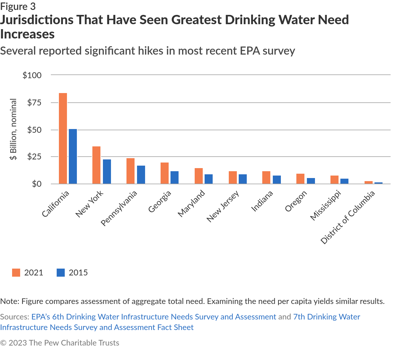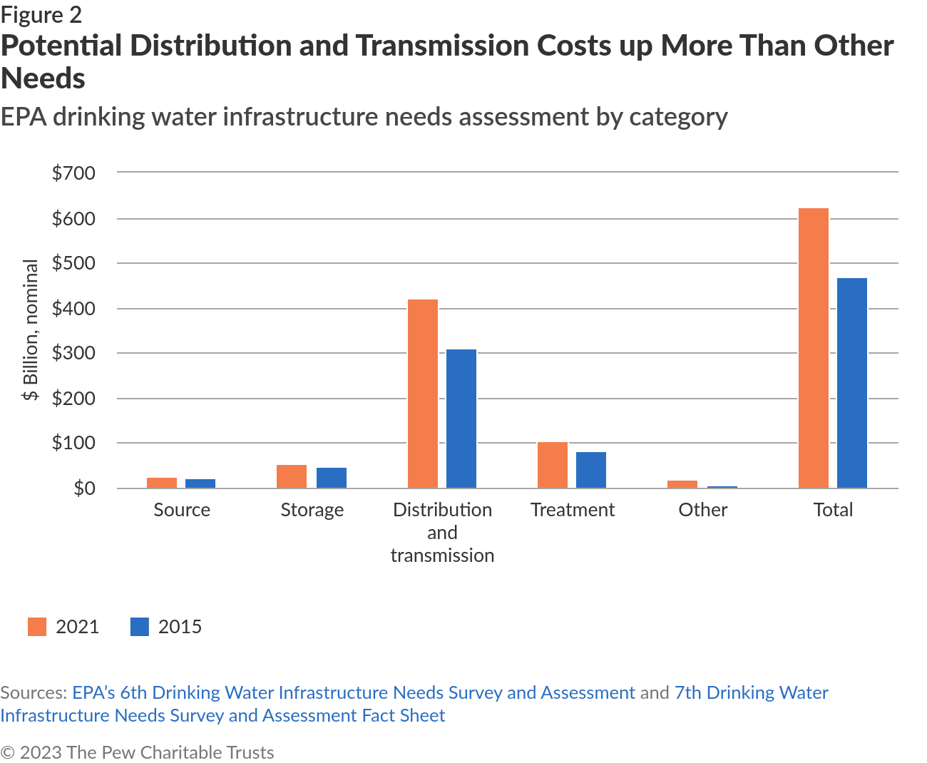 Notes: The totals reflect the expected costs of infrastructure work on the drinking water system over the next 20 years. Total National Need adjusted to 2021 dollars with the Construction Cost Index, as done by the Environment Protection Agency in previous Drinking Water Infrastructure Needs Survey and Assessment reports. Sources: EPA's 6th Drinking Water Infrastructure Needs Survey and Assessment done in 2015 and the 7th Drinking Water Infrastructure Needs Survey and Assessment |