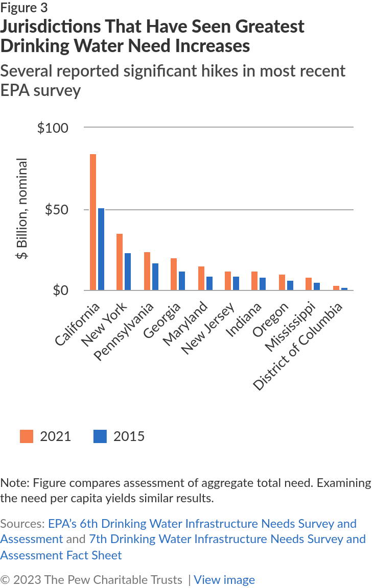 Failing infrastructure likely explains much of increased need in many states. For example, the city of Baltimore, which provides drinking water to nearly 2 million people in the metropolitan area, averages 1,000 pipe and water main breaks a year, owing to aging infrastructure that makes the water system unreliable. As a result, more than half of the city’s water budget is consumed by infrastructure repairs and replacements. In California, meanwhile, a state auditor report published in 2022 found that more than 300 water systems in the state could be classified as “failing” every year since 2017, affecting more than 1 million residents. Similarly, a 2017 New York comptroller’s report detailed issues with several of that state’s water infrastructure systems, including excessive water loss, and estimated that nearly $40 billion in repairs would be needed over the next 20 years.