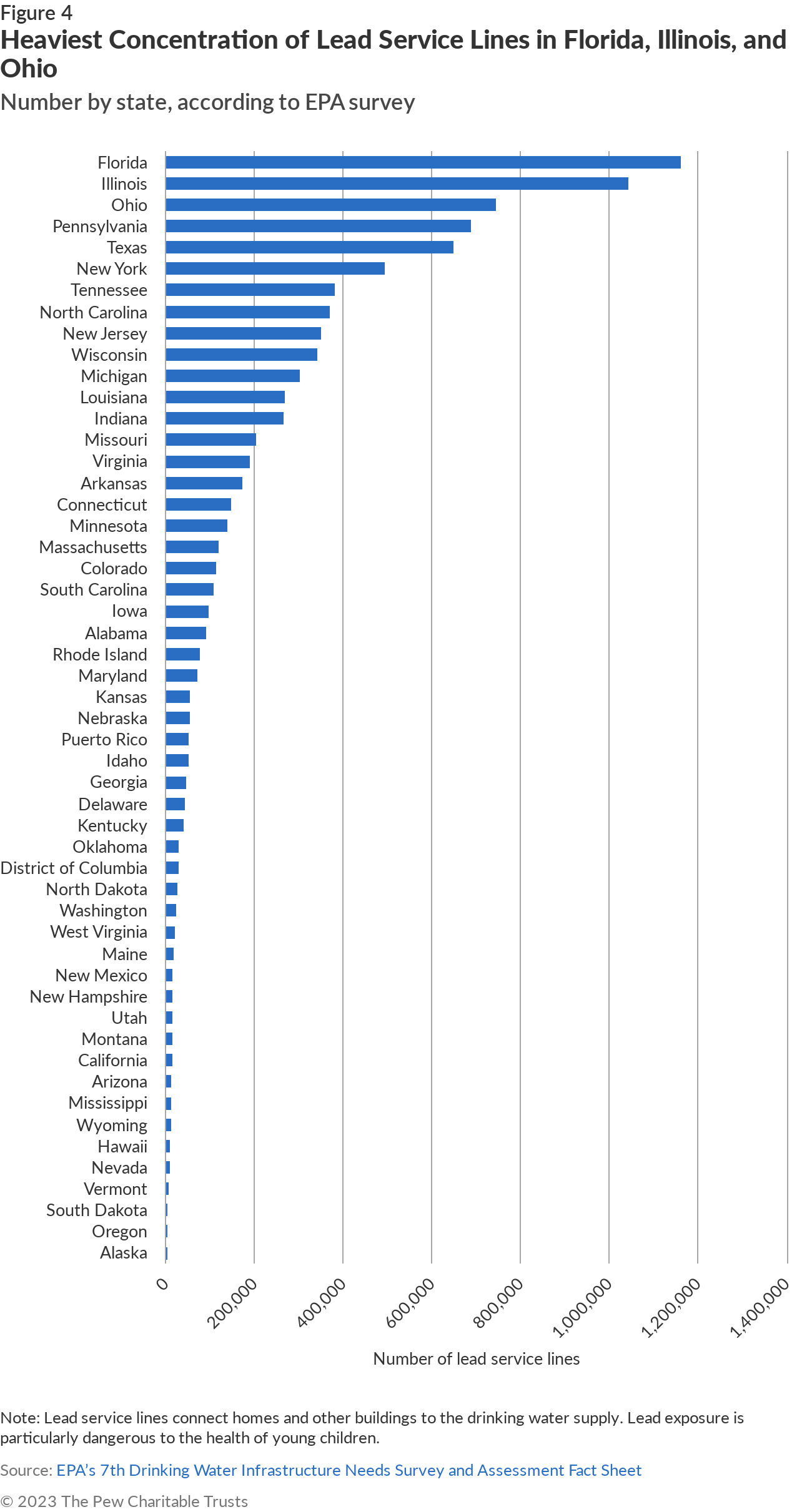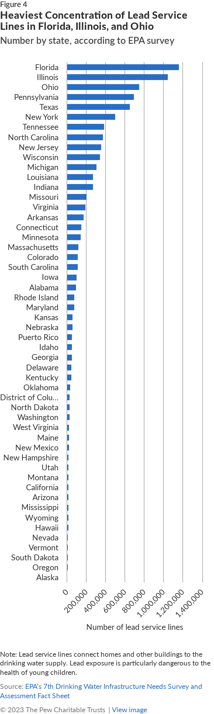 Importantly, the new DWINSA survey includes detailed information on lead service lines for the first time. These lines, which connect homes and other buildings to the water supply, are dangerous particularly because of the hazard that lead exposure poses to children. The EPA plans to use the new data to allocate about $12 billion provided in the IIJA for lead service line identification and replacement between fiscal years 2023 and 2026, to complete the distribution of the $15 billion Congress allocated -- with $3 billion having already been distributed in fiscal 2022. But the data suggests that this amount is unlikely to eliminate the problem: The survey found that there are nearly 9.2 million lead service lines in the U.S., with the heaviest concentration in Florida, Illinois, and Ohio. The EPA estimates that the average cost of replacing a line is $4,700, meaning that public water systems would need more than $43 billion to replace all of their lead service lines.