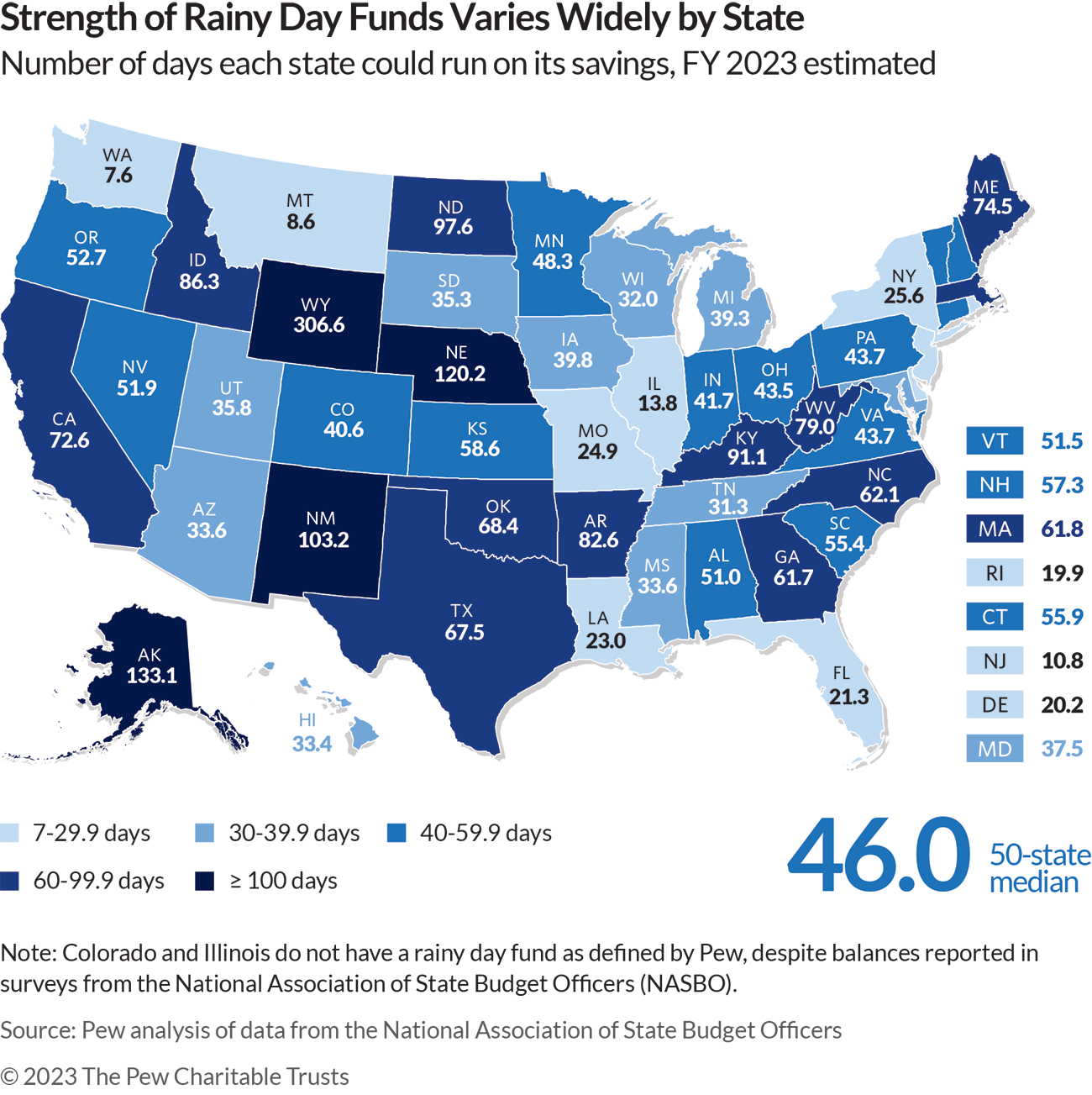 - Wyoming recorded the nation’s largest rainy day reserve as a share of operating costs (306.6 days), an effort to manage the state’s heavy reliance on volatile severance tax revenue. Three other states had more than 100 days’ worth of operating costs set aside: Alaska (133.1), Nebraska (120.2), and New Mexico (103.2).