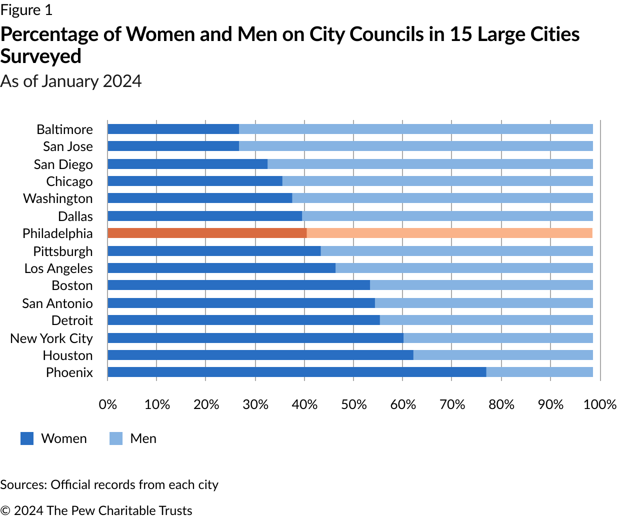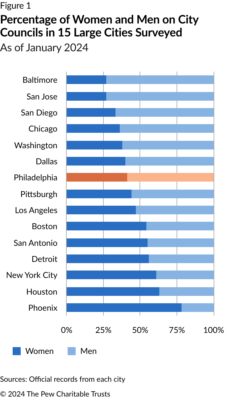 The current council members are largely new to their positions. Nine of the 17 members (53%) have not yet served a full term. Philadelphia, similar to many of the other cities reviewed for this analysis, also experienced an increase in the number of women serving on the City Council, reduced overall tenure, and increased salaries for elected officials. The Pew Charitable Trusts last examined city councils in Philadelphia and 14 other U.S. cities in 2016.