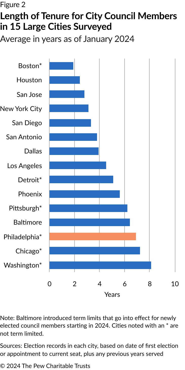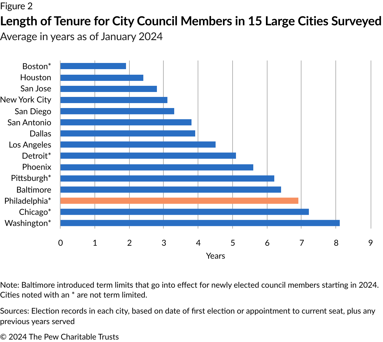 In 2024, the average tenure of Philadelphia’s 17 city council members—10 district and 7 at-large—is 6.9 years. That’s one of the longest among the comparison cities behind only Chicago and D.C. However, the average tenure length in each is heavily influenced by a few members with very long tenure, including Philadelphia Councilman Brian O’Neill, who has served more than 40 years.