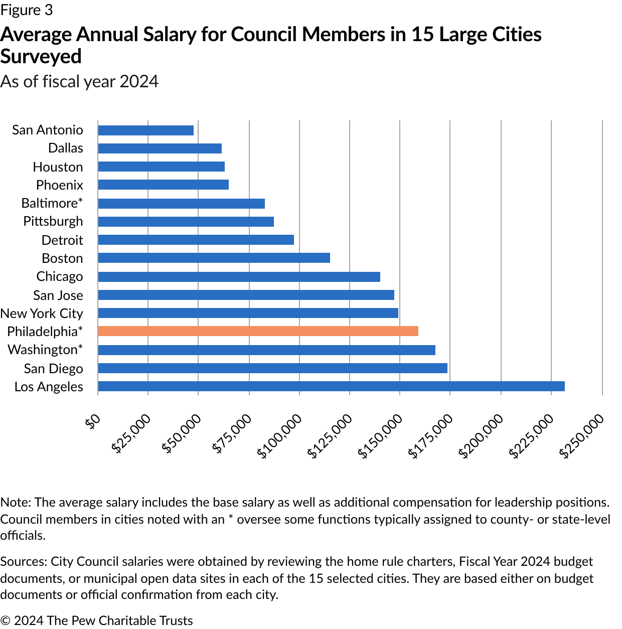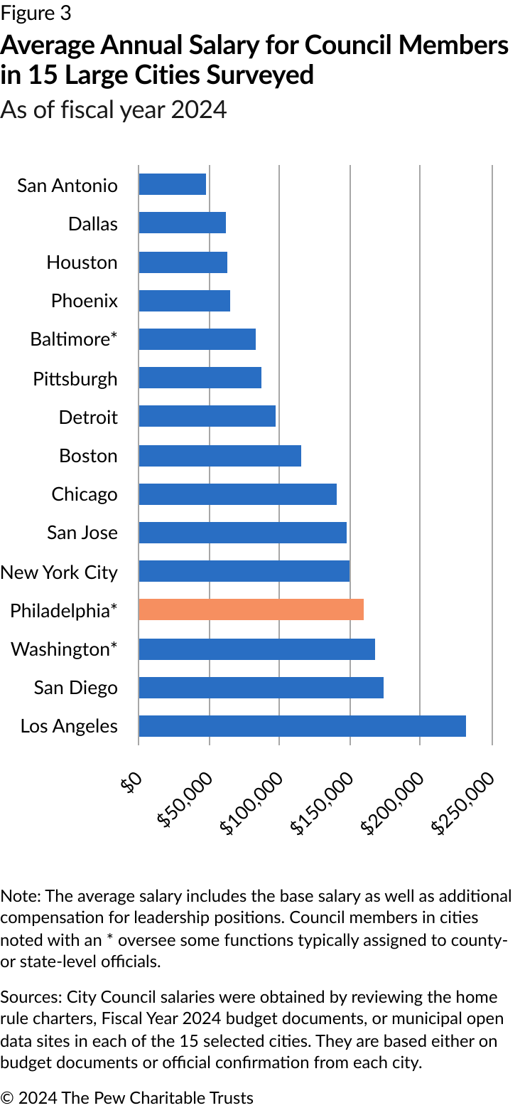 In 2024, the average salary for Philadelphia city council members is $158,949 (including base salary as well as extra pay for leadership or committee assignments), the fourth highest among the comparison cities. As in 2016, Los Angeles has the highest average council member salary at $231,802 and San Antonio the lowest at $47,177. (See Figure 3.) However, this may not capture total annual compensation from all sources because some cities, including Philadelphia, permit outside employment for their council members.