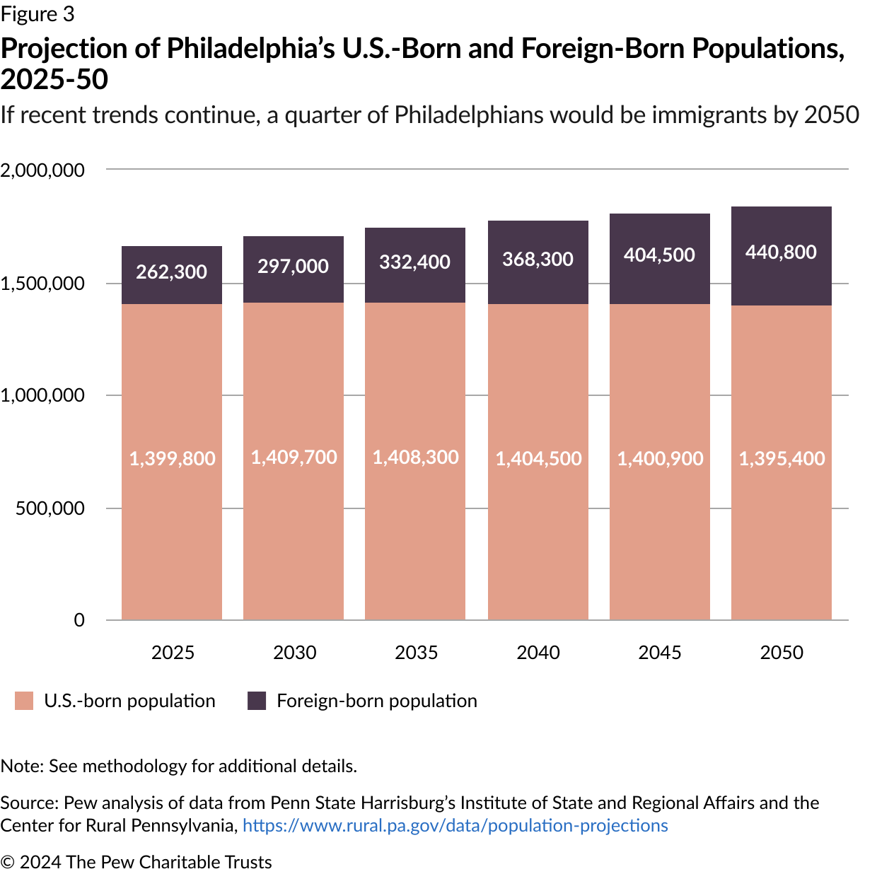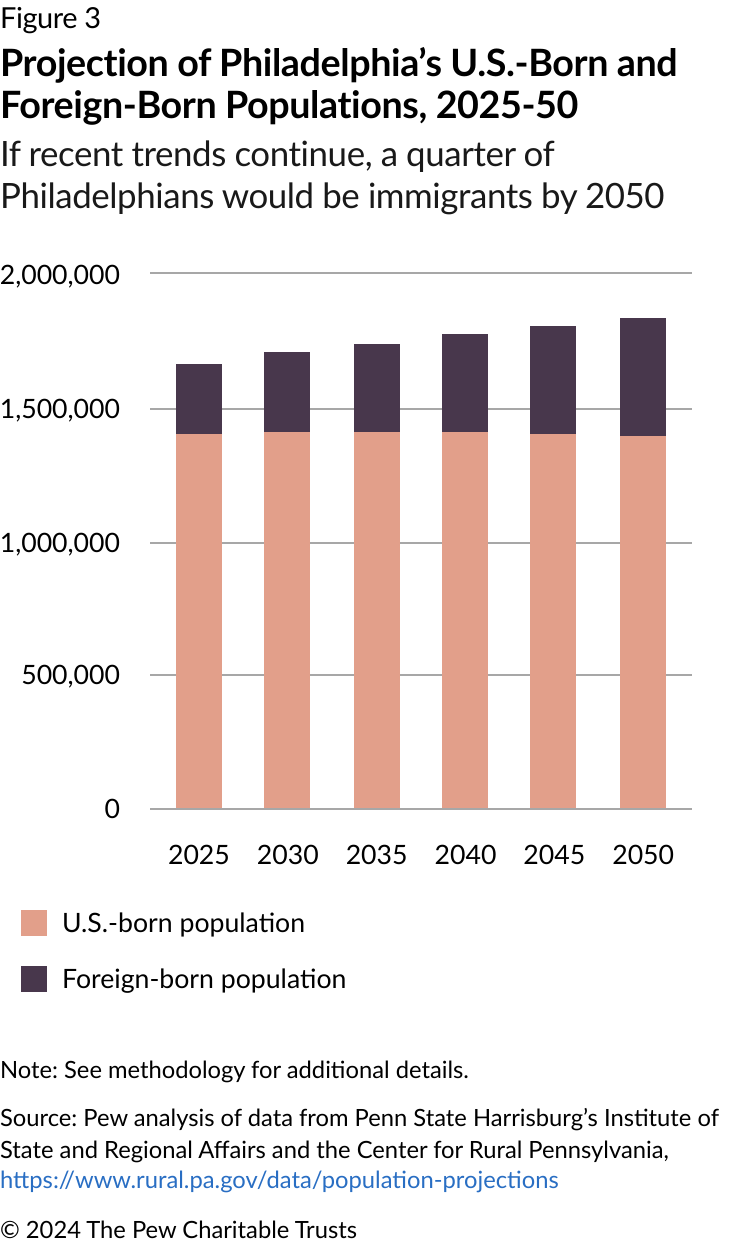 Immigrants themselves are a different story. If pre-pandemic trends continue, they could help lift the city’s population over 1,836,000 by 2050, based on Pew’s analysis of projections by Penn State Harrisburg’s Institute of State and Regional Affairs and the Center for Rural Pennsylvania. The U.S.-born population is projected to be essentially flat during this period. (See Figure 3.) Importantly, these projections do not include scenarios in which immigration drops—as it did from 2017 to 2020—or accelerates. The Penn State projections align with projections for the nation produced by the Congressional Budget Office and the U.S. Census Bureau.