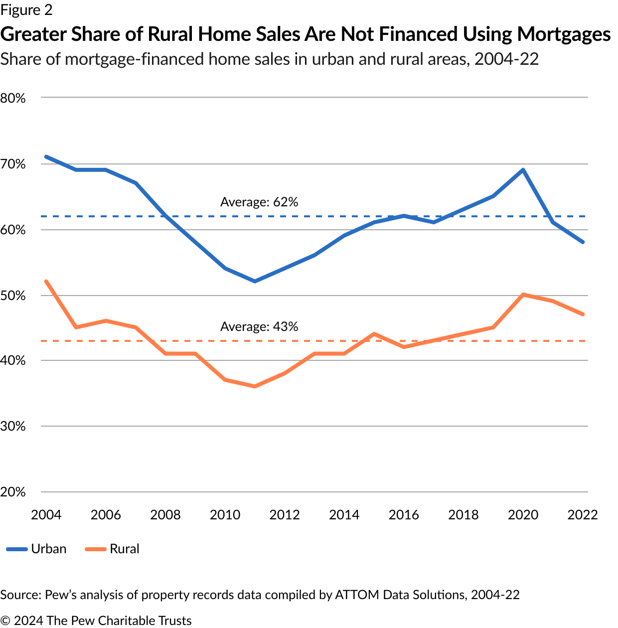Other homebuyers turn to alternative financing, such as land contracts, lease-purchase agreements, and seller-financed mortgages, even though these arrangements are riskier and more costly than mortgages. In 2021, Pew conducted a nationally representative survey that found that 12% of rural adults had used one or more of these alternatives compared with 8% of urban adults. Further, property records data shows that 25% of residential land contracts recorded from 2005 to 2022 were used to finance homes in rural areas even though these communities contained just 12% of the nation’s total home sales.