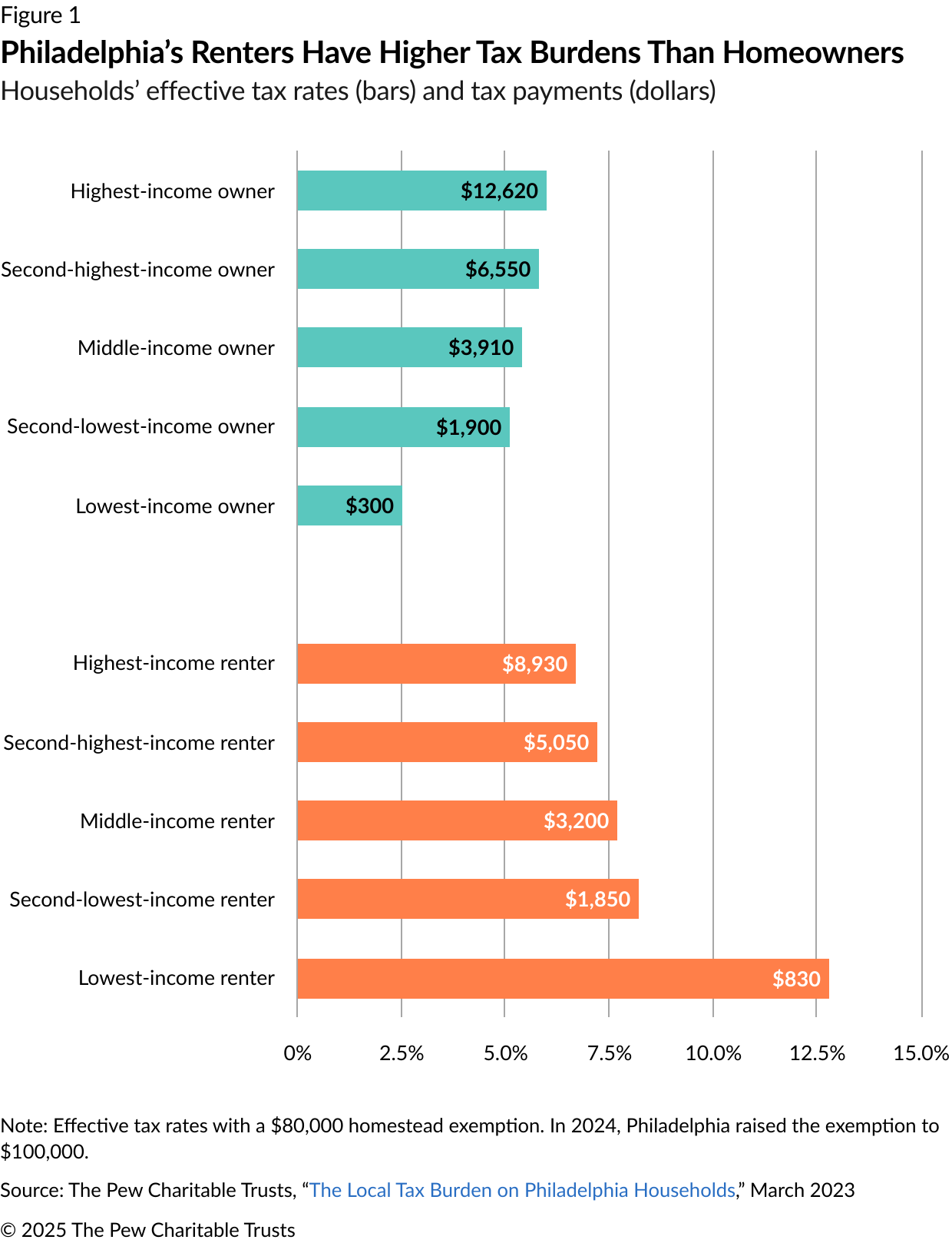 Pew’s research on Philadelphia’s residential tax burden found that the city’s overall tax structure has been mildly progressive for homeowners, mainly because of a relatively generous homestead exemption. But it is regressive for renters with no public subsidy for housing, who typically shoulder the cost of taxes in their rent payment but aren’t eligible for the homestead or other property-related exemptions, which offset the city’s “flat” tax rates and are required by the state constitution (see Figure 1). (In a regressive tax structure with identical flat rates for everybody, a decrease in a taxpayer’s income results in a higher tax burden, while in a progressive structure with variable tax rates, a decrease in a taxpayer’s income normally results in a lower tax burden.)