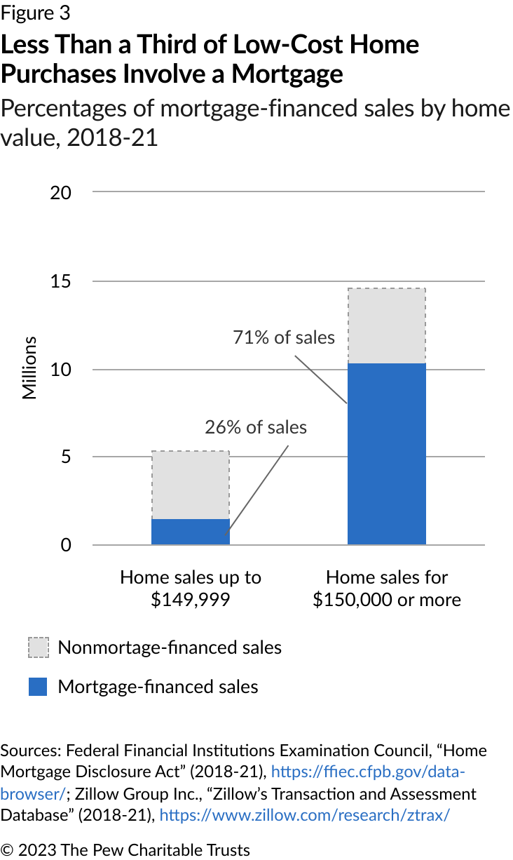 Millions of homes are sold each year for less than $150,000, yet a Pew analysis found that only 26% are financed using a mortgage, compared with 71% of higher-cost homes. Difficulty accessing small mortgages leads many families to forgo purchasing a home or to pursue alternative financing, such as lease-purchase agreements and land contracts, that leaves them vulnerable to financial losses. These arrangements lack many of the consumer protections afforded by mortgages, including inspection and appraisal contingencies that ensure that the homes meet minimum habitability standards and the ability to build equity and protection against quick evictions. Mortgages, unlike alternative financing, also include a clear process for transferring the property’s title from seller to buyer, guaranteeing that borrowers can demonstrate ownership.