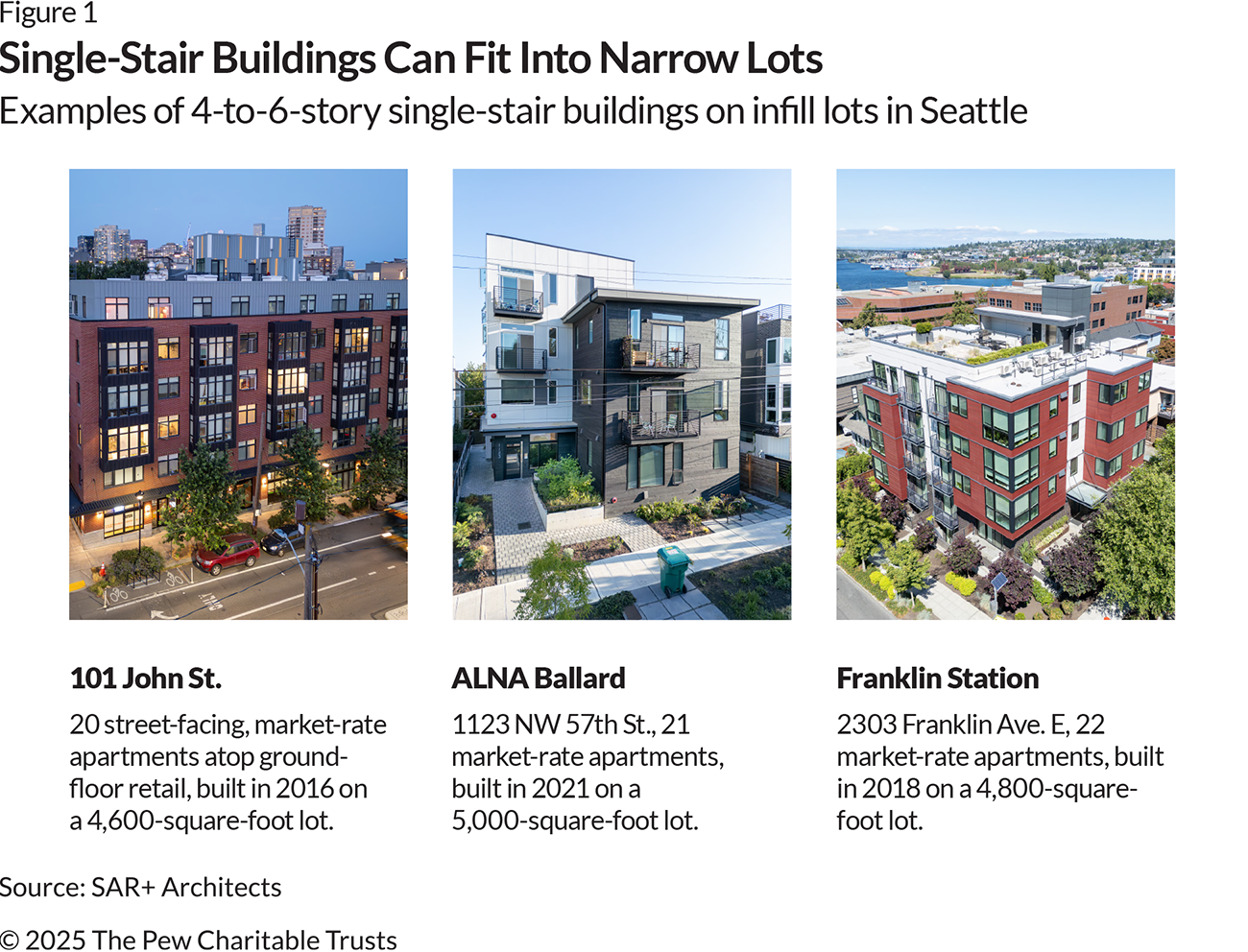 Most importantly, single-stair buildings are just as safe as large buildings with two or more stairs. A first-of-its-kind review of thousands of buildings in New York and Seattle conducted by Pew and the Center for Building in North America found no increased fire risk in single-stair apartment buildings compared with those with multiple stairs. Modern single-stair buildings include safety features such as sprinklers, fireproof stairs, self-closing doors, and smoke ventilation, and the smaller footprint provides quicker access to exits.